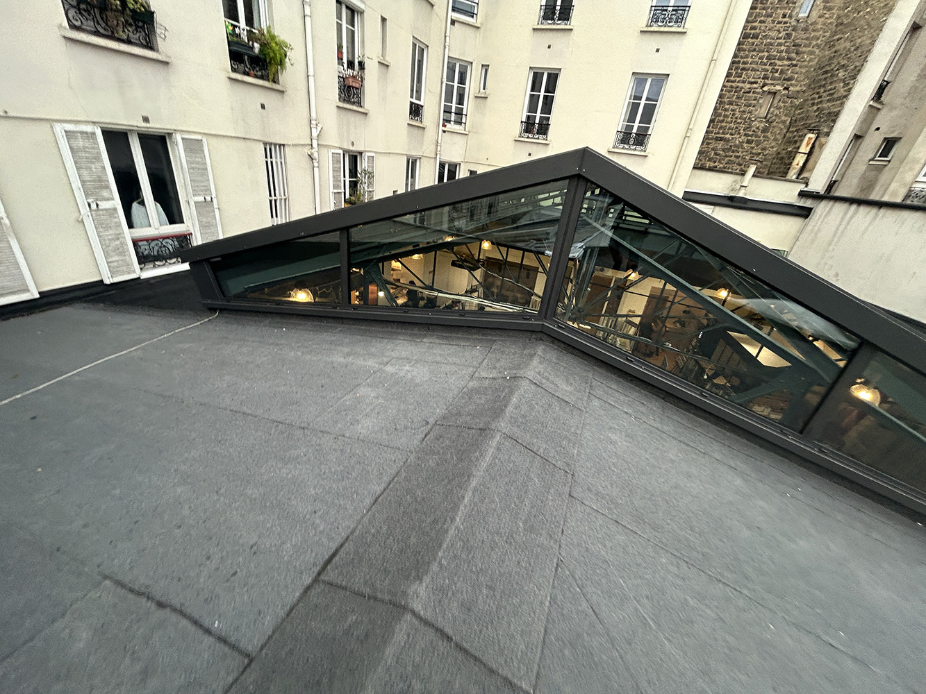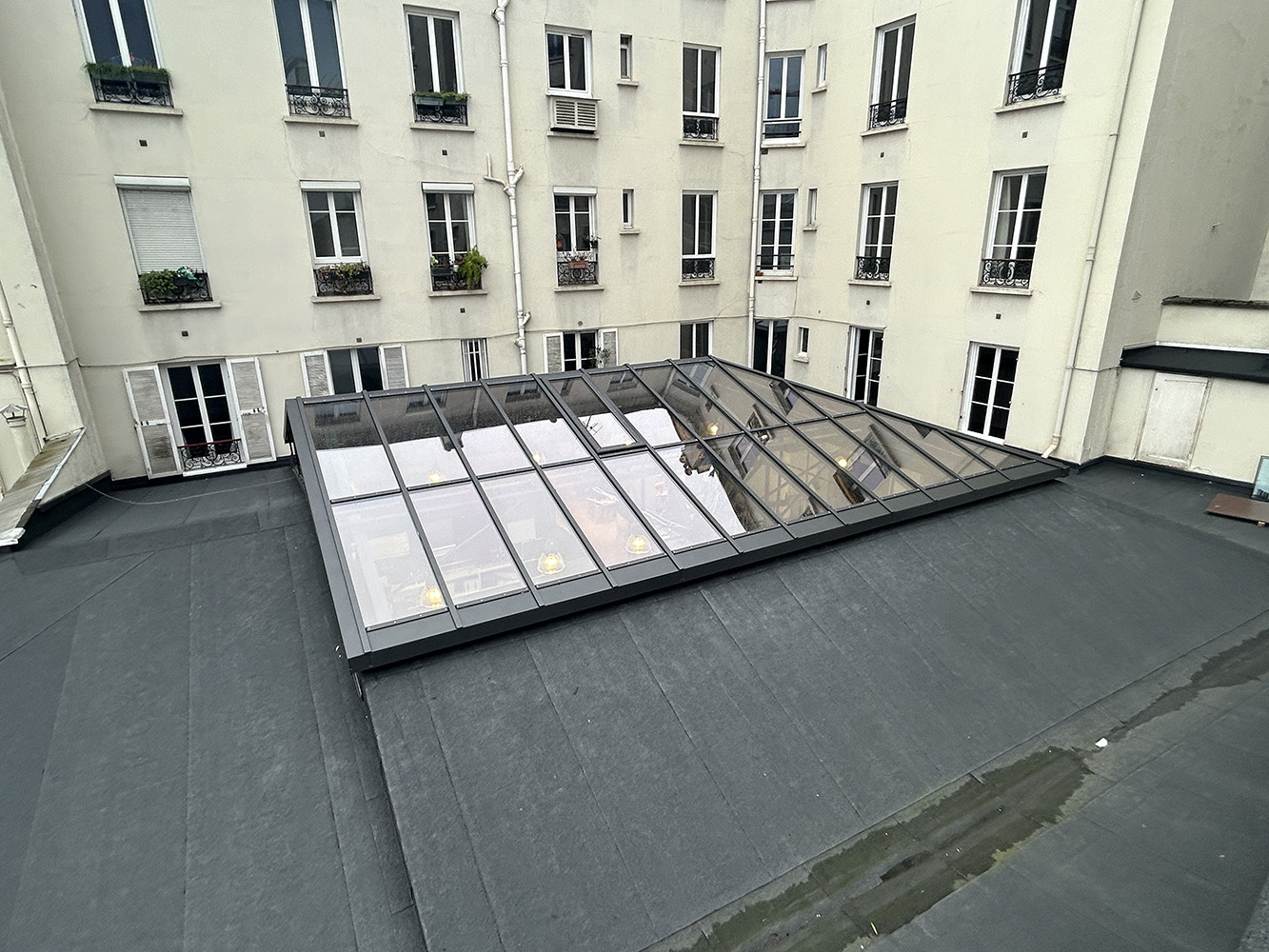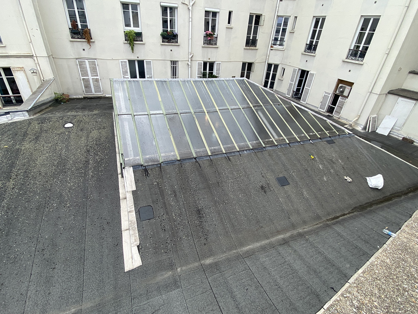 Réfection d’une terrasse totalement enclavée au-des- sus d’une très beau magasin. Avec mise en place d’une isolation conforme aux normes environmentales et reprise de toutes les nonconformités techniques. La verrière a été refaite par un spécialiste.