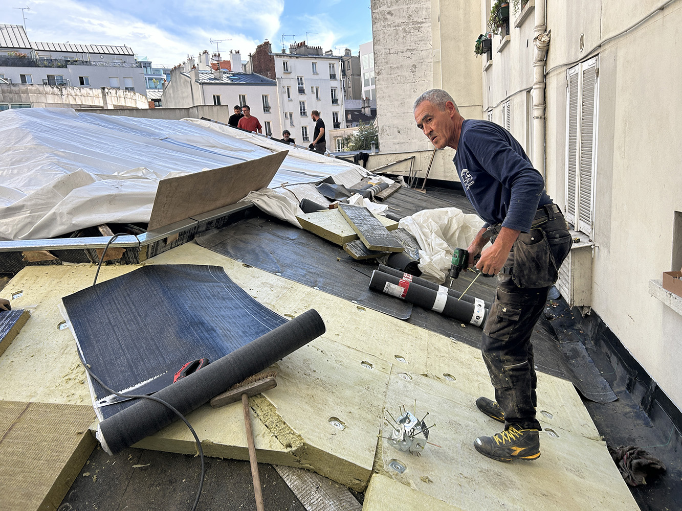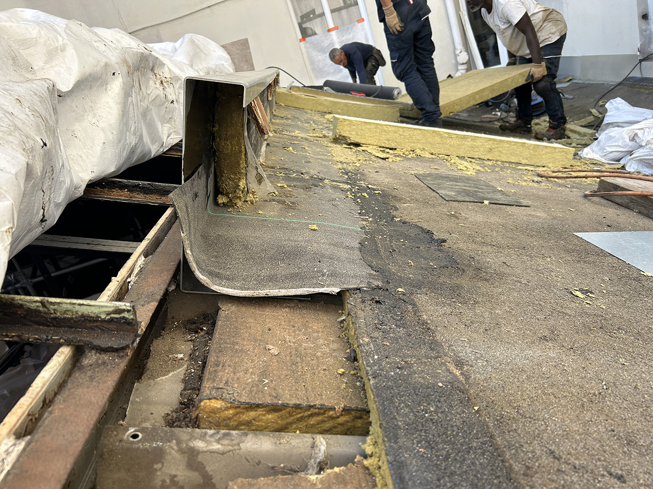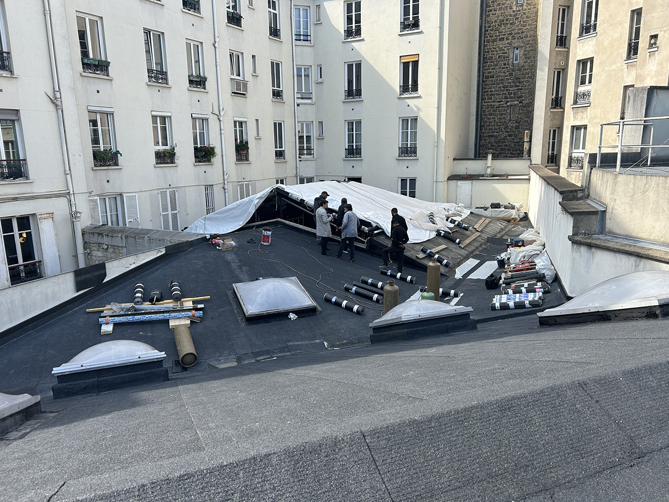 Réfection d’une terrasse totalement enclavée au-des- sus d’une très beau magasin. Avec mise en place d’une isolation conforme aux normes environmentales et reprise de toutes les nonconformités techniques. La verrière a été refaite par un spécialiste.